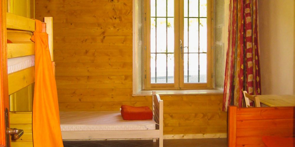 - orange room with 4 single beds, 2 of which are bunk beds, a cupboard and a desk