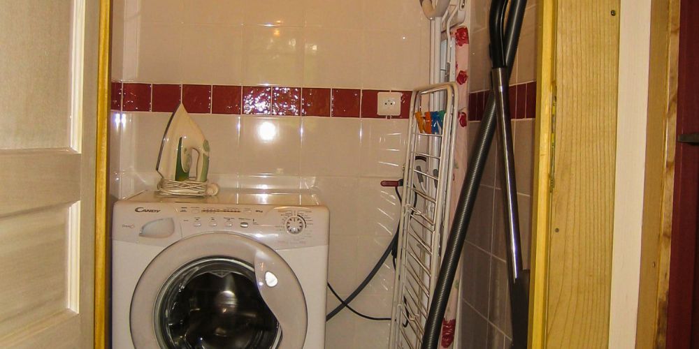 A well equiped laundry room (clothes washer, dryer, iron and ironing board) and cleaning material